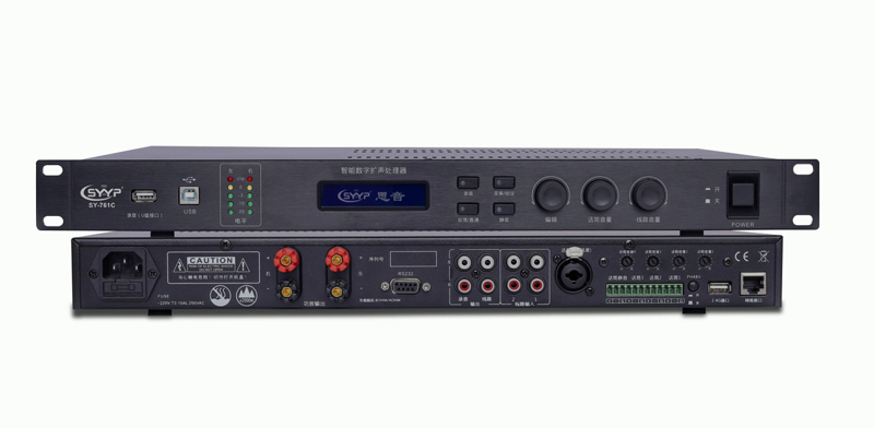 一:適用場所:會議室 法庭 多媒體教室 等場所 二功能特點 1.內置24Bit A/D、D/A轉換;24位DSP處理器,48KHz高速采樣,采用高速浮點運算。 2.采用自適應環境嘯叫抑制算法(AFC),采用高速浮點數字音頻處理器和先進的子帶降噪消除技術,可快速自動完全消除嘯叫和背景噪聲(ANC). 3.系統智能(AGC0)雙向電平控制技術,可以獲的到清晰、持續的、語音電平無明顯波動的輸出. 4.內置數字壓限器:可以保護突然大聲壓損壞喇叭. 5.數字噪聲門: 有多級閥值調整可以去除不需的聲音. 6.10段數字均衡:可以對音色進行調整補償. 7.帶參數鎖定功能:調試好的參數一鍵鎖定.可以避免參數誤操作 8.功能可以通過電腦PC界面來調節設置,支持中控.PC界面可以友好設置為管理員模式和普通用戶模式. 9. 3路麥克風輸入,獨立的調整靈敏調證. 10.每路MIC獨立的48V幻象電源供電,可以獨立開關. 11.自帶8歐2*150W數字功放.體積小(1U機箱)重量輕4.5KG 12.開關電源供電寬電壓輸入170-250V輸入. 13.自帶USB錄音接口,可以直接插U盤錄音支持各種音頻格式 三:技術參數 話筒供電 :48V幻象電源 話筒輸入電平;-57dBu——-12dBu 麥克風輸入:3路,卡農接頭 音頻輸入:RCA立體聲輸入2組 錄音輸出:RCA立體聲輸出2組 控制接口:RS-232接口1個,USB接口1個 功率:2X150W/ 8Ω,180W/4Ω 功放輸入靈敏度:0.775V 頻率響應:(直通頻響30Hz to 20kHz.反饋抑制頻響 50Hz~16KHz) +/- 1dB 線路: 20Hz——20KHz 信噪比:≥100Db(未計權) 傳聲增益提升:8- 12dB 背景降噪:提升系統信號比≥20dB 自動增益控制幅度:-12dB——+12dB 電源:AC170-250V50/60Hz 體積(寬X深X高):480*280*45MM 毛重:4.7KG