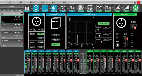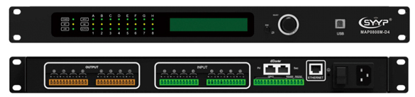 MAP0808M-D4是一款8進(jìn)8出的自動混音媒體矩陣,配備8路模擬輸入和8路模擬輸出,內(nèi)置反饋抑制,自動混音,矩陣混音,均衡器,分配器,壓縮器等DSP功能,支持Dante網(wǎng)絡(luò)音頻功能擴展,通過USB免驅(qū)連接電腦軟件控制,RS232,TCP/IP連接中控遠(yuǎn)程控制,適合用在各種場合的擴音工程。 ■4路Dante網(wǎng)絡(luò)數(shù)字音頻輸入,4路Dante數(shù)字音頻經(jīng)DSP處理后輸出 ■8路模擬音頻輸入8路模擬音頻輸出,支持麥克風(fēng)輸入和線路輸入自由切換 ■Dante網(wǎng)絡(luò)數(shù)字音頻與模擬音頻可自由切換 ■每路輸入帶48V幻象電源,可以上位機軟件開關(guān)控制 ■模擬音頻每路輸入帶反饋抑制功能開關(guān),兩檔調(diào)節(jié) ■帶自動混音和矩陣混音功能 ■帶攝像跟蹤功能 ■輸入31段PEQ可調(diào),輸出10段PEQ可調(diào) ■USB免驅(qū)自動連接軟件,支持TCPIP多臺機器集中管理調(diào)試,配置RS232/RS485中控控制接口,GPIO外擴控制接口