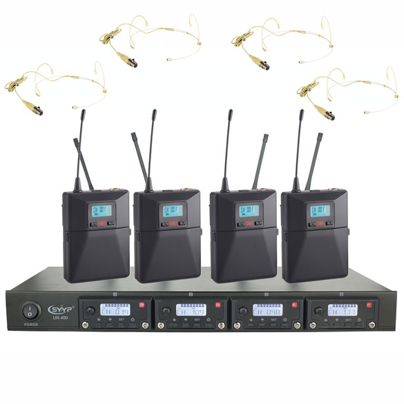 一拖四無線頭戴、領夾,直線接收距離60米,可用于小型戶外演出、學校,200個頻點可調