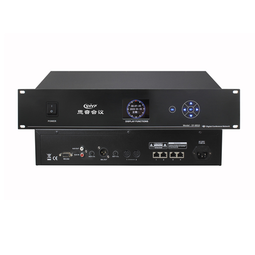1.主機自帶2.8寸高清彩色液晶顯示屏,獨立按鍵操作,簡單明了。 2.主機在等待操作期間,會自動切換到高清時鐘界面,實時顯示當前時間。 3. 采用數字集成電路技術,內置高性能CPU,低功耗、高保真、極穩定; 4. 主機同時具有4路網線接口和2路八芯接口,用于連接會議單元。 5. 七種發言人數可選:1-6(人可選 )、N(全開放)。 6.具有限時發言功能,可設定發言人的發言時間,到時自動關閉話筒。 7.多種發言模式:先進先出模式、主席專用模式、全開放模式等。 8.斷電智能記憶功能,可記憶程序原運行狀態。若意外斷電后,通電即恢復最后一次設置; 9.具有中/英文語言切換功能; 10.主機可連接80個會議話筒單元,增加擴展主機最多可以連接512個會議單元。 11.具有聲控開咪功能,發言人不需要在發言前進行任何操作,會議單元在識別到有聲音輸入時,自動開啟。 12.具有輔助輸入輸出功能:輔助輸入可連接如手機、電腦等外部音源,輔助輸出可連接外部錄音設備或把聲音輸出給遠程視頻會議終端。 13.輸入輸出的音量大小可調節。 14.具有RS-232接口,可連接中控系統或電腦,支持232協議代碼控制,令會議設備智能化。 15.具有雙重防雷功能,能在一定程度上防止雷電引起的電涌對系統主板的損壞。