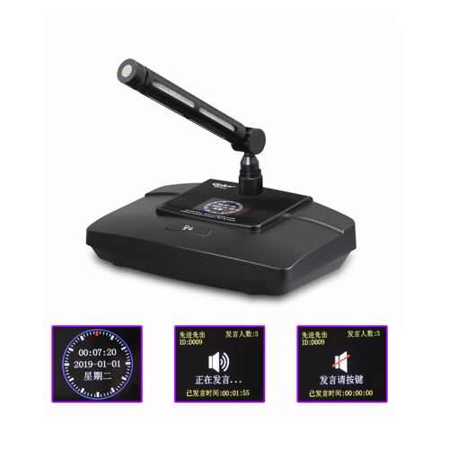 1. 單元采用2英寸高清彩色液晶顯示屏,等待操作期間,會自動切換到高清時鐘界面,實時顯示當前時間。 2. 發言期間,顯示屏會顯示已發言時間,限時發言時,發顯示剩余可發言時間。關閉發言后,會顯示靜音標志,和“發言請按鍵”指示。 3. 每一個會議單元有一個唯一的編號,支持中控設備用平板電腦控制打開和關閉發言狀態,方便集中管理會議進程,讓會議室更智能化。 4. 專業高保真電容咪芯,拾音靈敏、語音清晰,帶寬達到20Hz~20KHz 5. 采用防干擾電路設計,可防止手機等電子產品的干擾。 6. 會議桿頭部帶發光燈圈,可顯示單元發言、關閉狀態。 7. 單元為無源設備,由系統主機供電。輸入電壓為24V,屬安全范圍。 8. 單元由1.5M*2M T型8芯線及超六類網線連接,線材采用全線鋁箔、水線屏蔽,大大降低強電磁波對線材的干擾。 9. 帶聲控啟動功能,發言時話筒單元電源自動打開(需要主機開啟此功能)。 10. 支持多個主席單元,連接時不受位置限制可任意安裝,具有全權控制會議秩序的優先功能,可控制會議氣氛。 11. "手拉手"電纜串聯連接模式,便于安裝和維護。萬一某個單元損壞也不會影響其它單元使用。 12.主席單元擁有優先發言權限,可以隨時打斷代表單元發言。