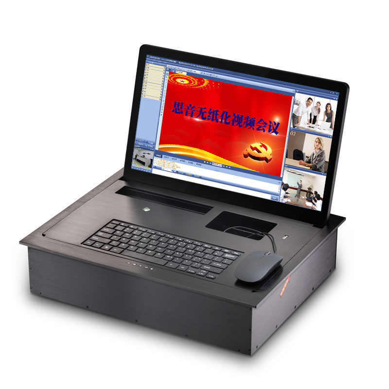 為了解決單純觸摸屏錄入文字慢的問題,我公司專門研究TUT-1561搭載15.6寸觸摸屏,自帶鍵鼠式翻轉無紙化會議終端。它集翻轉顯示器,升降鍵盤,電腦主機,無紙化UI界面于一體,開啟翻轉器后,顯示器自動翻轉成一定角度,鍵盤也隨著升起,外形輕巧美觀大方,最新機械防夾手功能,安全可靠,翻轉面板上配有開關,USB,操作按鍵。可以單機遙控也可通過中控實現多臺集合控制。