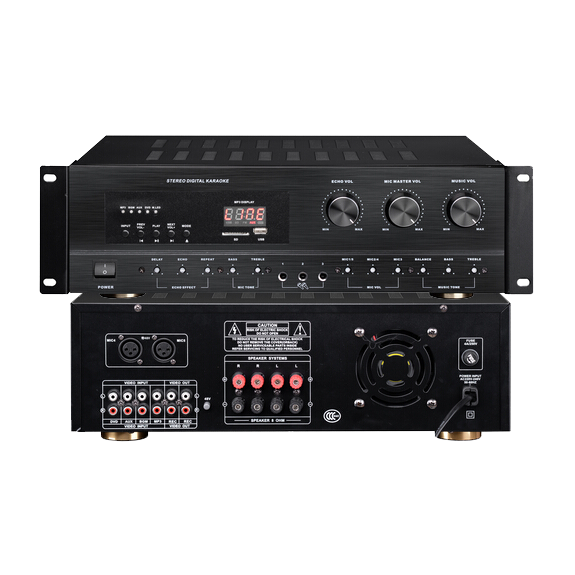 1. 3U機型,經典拉絲鋁面板外觀 2. 面板全部為暗調式旋鈕,可調節話筒的混響效果,高低音均衡調節,與音樂的高低音調節. 3. 總共有五路話筒輸入,前三路為6.35插座,后兩路為卡農平衡輸入,并設有48V幻象電源. 4. 音樂信號有四路輸入,兩路錄音輸出 5. 設有USB/藍牙播放器,帶有數碼管顯示和語音提示音(語音可以關閉) 功率/POWER(8歐): 130W / 150W / 250W 輸入阻抗/INPUT IMPEDANCE: 20KOHM 總諧波失真/THD : 0.2% 頻率響應/FREQUENCY RESPONSE: 35HZ-20KHZ 信噪比/SNR: 82DB 消耗功率/POWER CONSUMPTION: 350W 輸入靈敏度/INPUT SENSITIVITY: 0.25V 冷卻/COOL DOWN: 風扇 保護/PROTECTION: 短路,直流 外形尺寸 Machine dimensions: 430X358X132mm 包裝尺寸 Carton size: 490x430x180mm